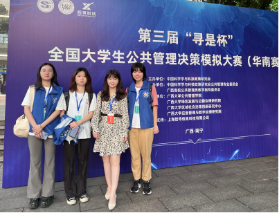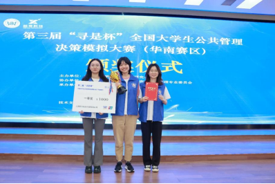 本网讯 4月27-28日,由中国科学学与科技政策研究会主办,广西大学公共管理学院、广西大学绿色发展与边疆治理研究院、广西大学区域社会治理创新研究中心、广西大学应急管理与数字治理研究院承办的第三届“寻是杯”全国大学生公共管理决策模拟大赛(华南赛区)在广西大学举行。本次大赛有来自华南地区49所高校,共50支队伍参赛,由我院三名学子组成的广东外语外贸大学代表队从50支队伍中脱颖而出,荣获一等奖。