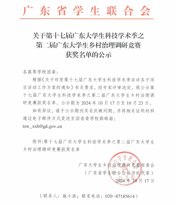 2024年10月13日,第二届广东大学生乡村治理调研竞赛决赛颁奖仪式在我校大学城校区顺利举办。此次大赛由共青团广东省委员会、广东省教育厅、广东省科学技术厅、广东省科学技术协会与广东省学生联合会主办,广东外语外贸大学承办,广东省社会管理研究会协办。我校获一等奖3项,二等奖1项,三等奖3项。其中我院学子在老师的精心指导下,获得大赛一等奖3项。