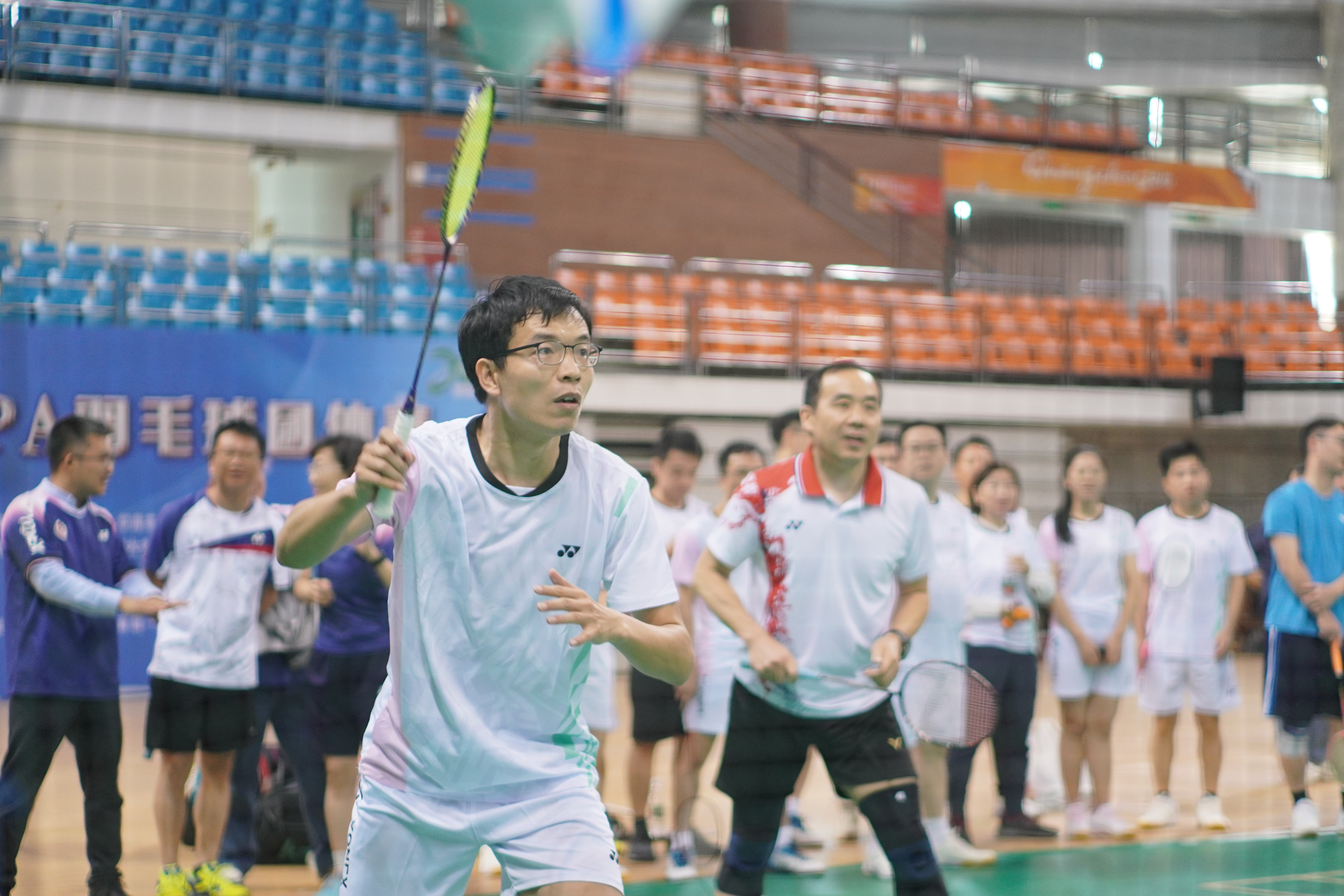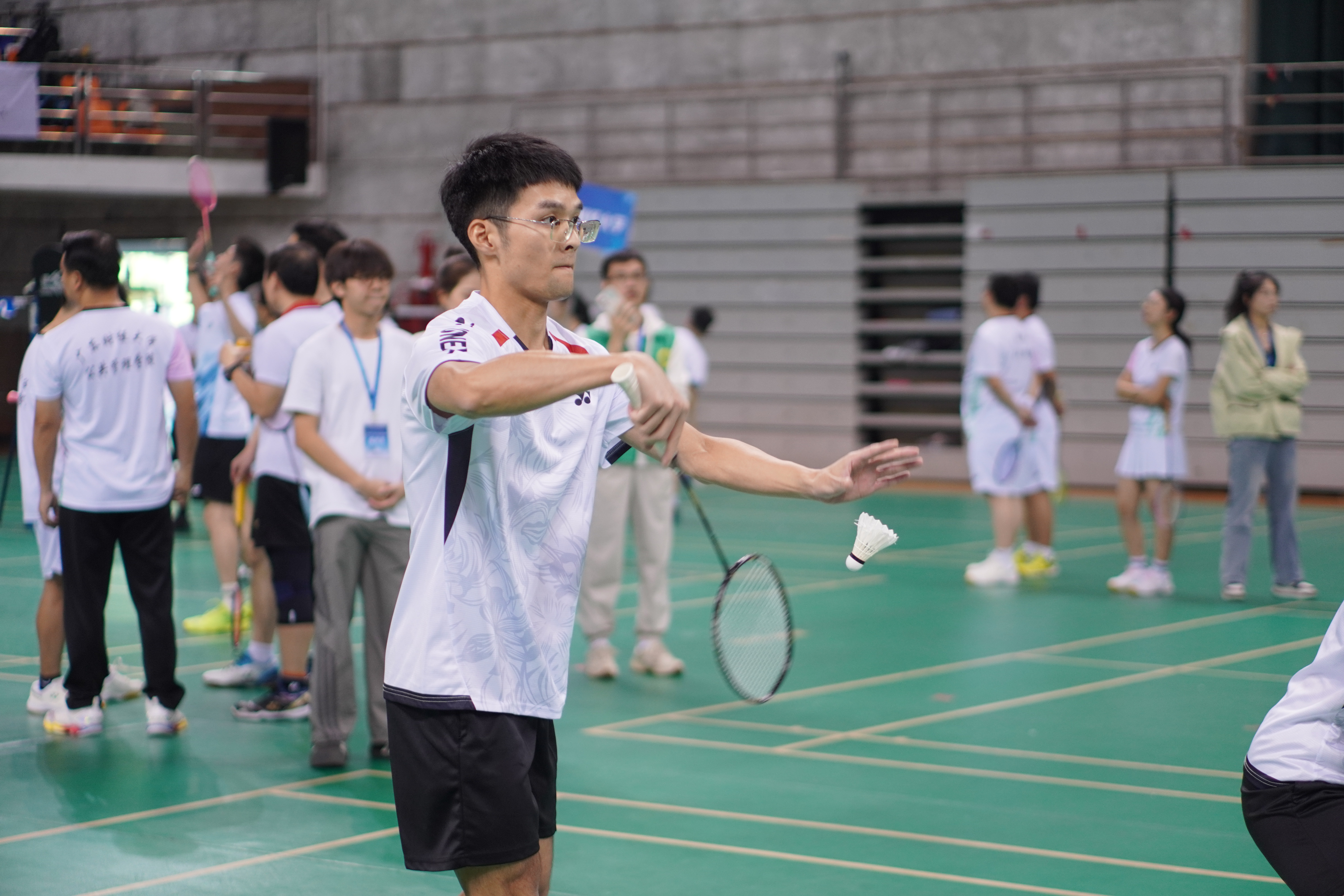 在比赛中,各校院领导们相互切磋,默契配合,展现出团队协作的魅力。每一次精准的击球、每一次精彩的扣杀,都引发了观众们的阵阵喝彩与掌声。赛场上,欢笑与竞争交织,友谊与激情碰撞,形成了一幅生动的画面,让人感受到羽毛球运动所带来的无穷乐趣。