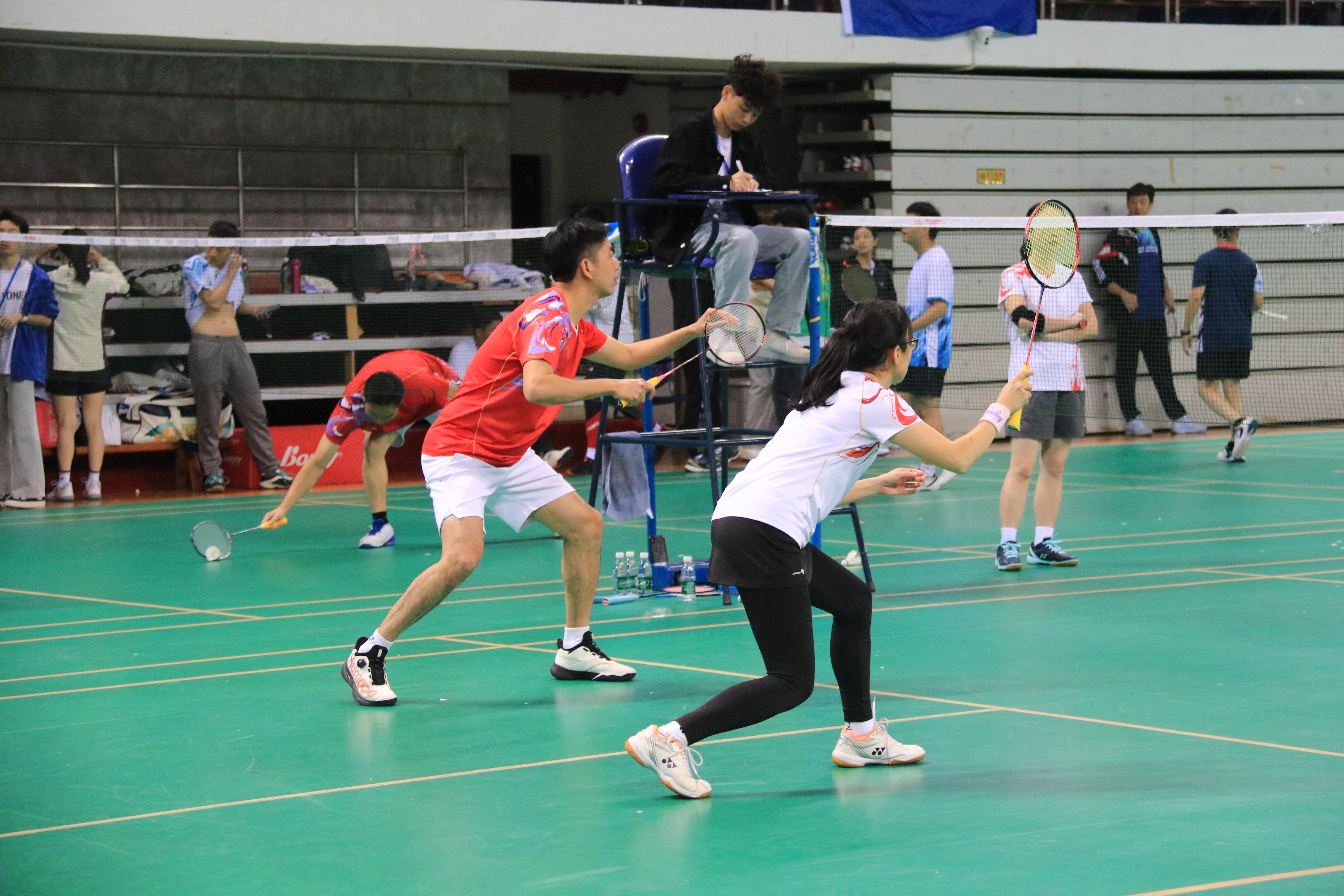 “轻羽如雪在空中舞,挥拍似箭破云霄。响声震耳如雷鸣,势如虹霓贯长空。”在裁判员的哨声响起瞬间,比赛正式开启。场上的运动员们拼尽全力,挥洒汗水,奋勇争先,为了荣誉而全力以赴。与此同时,场下的助威团和拉拉队的欢呼声、掌声和呐喊声此起彼伏,激励着每一位选手,气氛热烈而振奋人心。14支队伍在赛场上展开激烈角逐,毫不退缩,展现出顽强拼搏、奋发向上的体育精神。