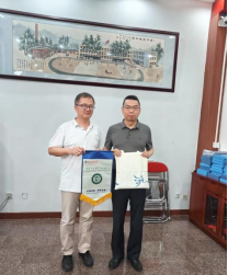 邵兵向两校负责人赠送学院旗帜