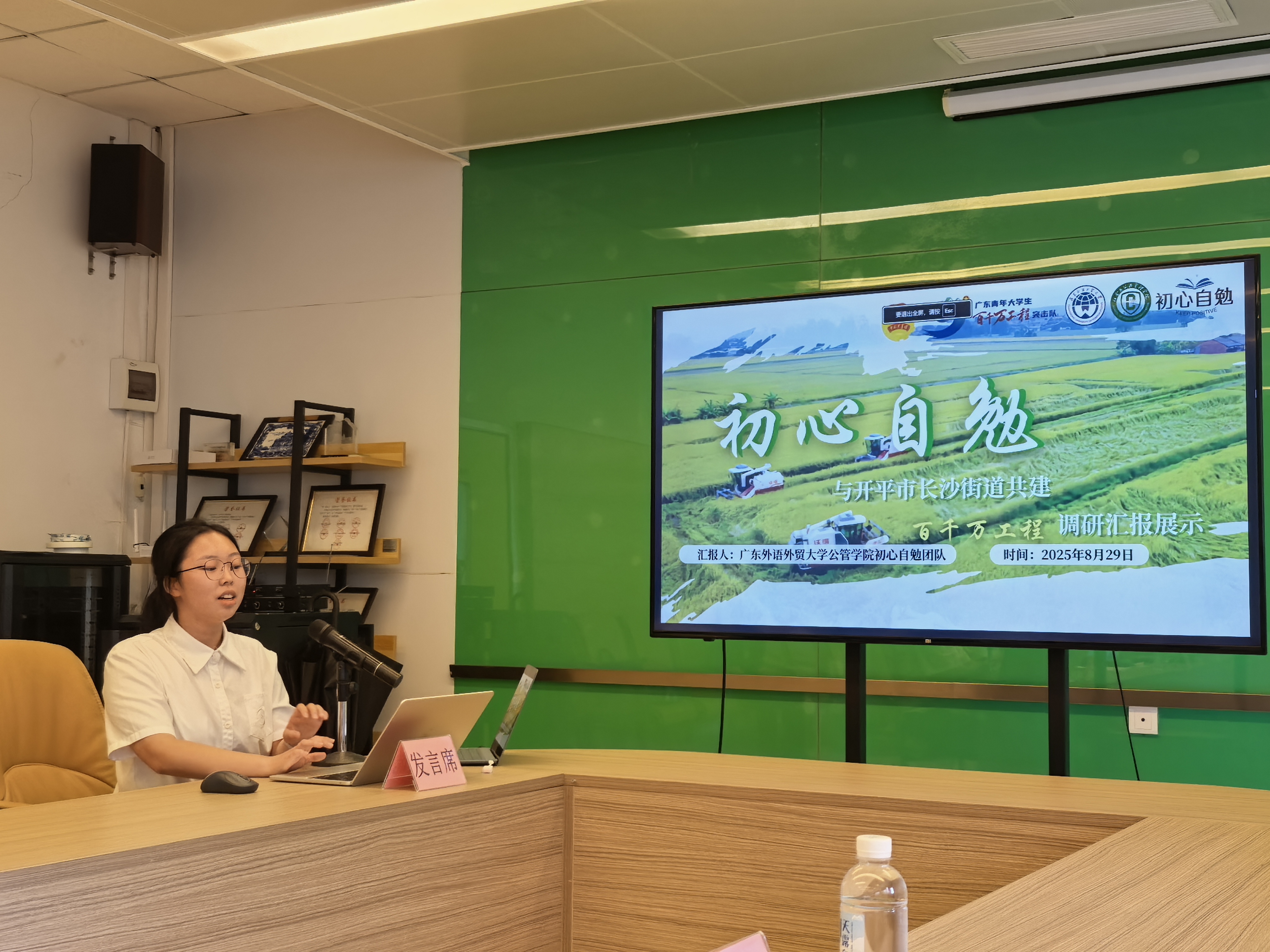 我院“初心自勉”中西队与学贯队负责人分别上台汇报结对共建项目实践成果。该团队自8月24日赴开平市三埠街道与长沙街道开展“百千万工程”调研,通过深入村落、企业,发现现存治理问题并提出派驻大学生村官、引入乡贤共治、推动产业融合等对策建议,助力乡村振兴与高质量发展。同学们运用专业知识对基层治理问题进行了深入的调研和剖析,高质量的视频更是赢得了阵阵掌声。