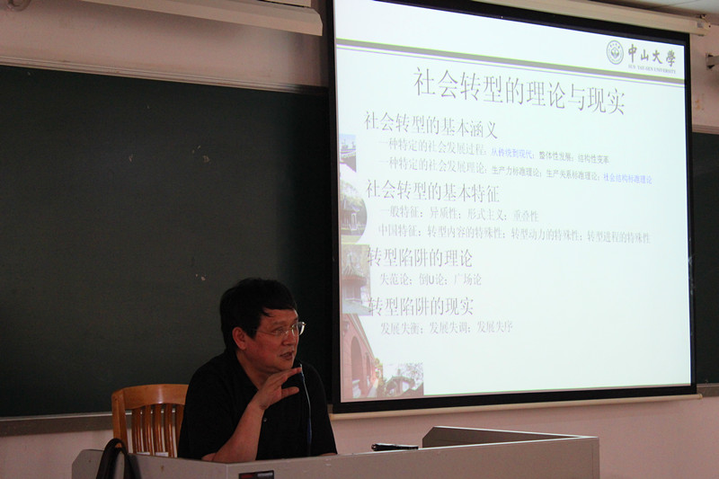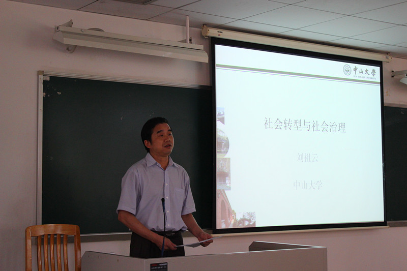 此次讲座一开始,彭院长就向大家隆重介绍了刘祖云教授。刘教授是中山大学港澳珠江三角洲研究中心教授,中山大学社会学专业博士生导师,中山大学城市住房研究中心主任,国家规划重点教材《发展社会学》主编,《中国社会科学》杂志特约评审专家,并参与了很多刊物的出版。听完彭院长的介绍,老师和同学们对刘教授的到来表示热烈的欢迎。在台下同学们热烈的掌声中,刘教授上台进行精彩演讲。