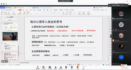 最后由学校实习组的冯君萍(广州市轻工技师学院心理学科心理辅导教师)、叶嘉恩(倍多分教育心理辅导教师)以及李浩然(东莞市第一中学心理科高中心理教师)3名同学进行了学校实习经验分享,同学们从教师资格证考取、培养多元兴趣爱好以及面试经验等方面详细介绍了学校类工作特点和面试经验。