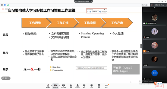 首先,由企业实习组的陈祉鎏(DDI智睿咨询咨询部项目实习生)、黄绮颖(广汽蔚来人力资源部HR实习生)、曹洋洋(深圳帝迈生物技术人资部HRBP实习生)、余卓君(新东方员工关系与企业文化HR实习生)以及韩语欣(零牌顾问机构咨询部人力资源咨询助理)5名同学进行了职场经验分享,同学们用专业职场风格的商务PPT从实习工作和个人复盘两部分进行了分享,针对身份转变、棘手问题处理、实习薪酬等问题深入浅出的进行了回答。