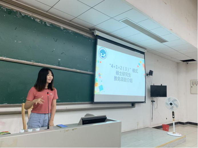 “4+1+2(3)”项目获得者、我院2015级毕业生饶卉向同学们展示了学校“4+1+2(3)”硕士研究生推免项目,从“4+1+2(3)”项目的含义、申请条件、推荐程序、工作职责与待遇等方面做了详细介绍,并分享了自己选择该项目的初心,希望大家从职业发展的角度找到自己认为有意义的工作;“4+1+2(3)”项目获得者、我院2013级学生代表刘倩麟介绍了研究生支教团项目,就研究生支教团的申请程序、福利待遇、广外研究生支教团的发展历程、招募条件和政策保障等情况做了详细介绍,分享了她支教期间的主要工作内容,以及支教期间的切实感受。