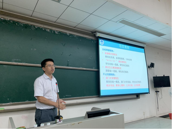 学院副院长张信勇系统概括地介绍了广外本科生推荐免试攻读研究生的概况,包括推免项目类别、选拔条件、名额分配等,并且鼓励优秀的获得推免资格的学生积极报考广外。