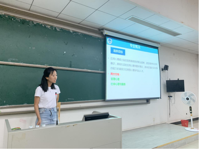 徐盈艳主任向各位同学简要介绍了学院三个硕士点的推免生招收方案,鼓励符合推免资格的同学积极争取。并为同学们介绍了社会工作硕士点的情况,从硕士点的发展历史、社会工作专业的培养特色到目前师资结构情况、培养目标和就业方向等方面做了详细介绍,让同学们对社会工作专业硕士的招生有了进一步的了解。接着,王俊静主任向同学们介绍了应用心理硕士点的建设情况,包括应用心理硕士点的发展历史、培养目标、研究方向、师资力量、就业前景和第一届招生情况,并欢迎同学们报读应用心理专业硕士。