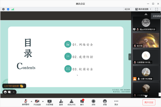 会议伊始,潘相宇书记介绍了此次会议的重要性,她从疫情期间学校及学院的相关管理制度、网络安全、宿舍安全、防诈骗和人身财务安全五个方面阐述了此次安全教育大会的重点内容。