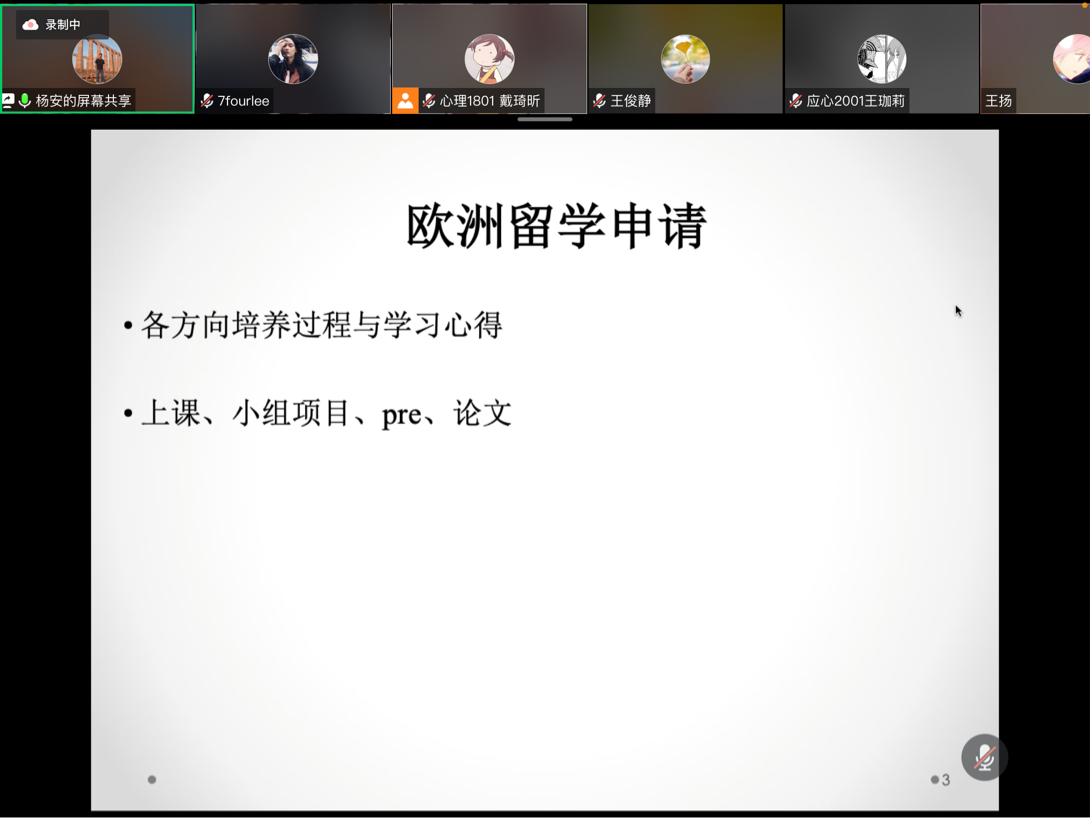 2021年7月7日下午14点,伟德国际victor1946应用心理学系通过腾讯会议开展了职业生涯规划系列讲座(一):出国(境)留学篇讲座。主讲人为应用心理学系毕爽老师、杨安老师和刘方松老师。会议由应用心理学2001班陈雨桐主持,心理学系全体本科生和研究生参加了此次讲座。