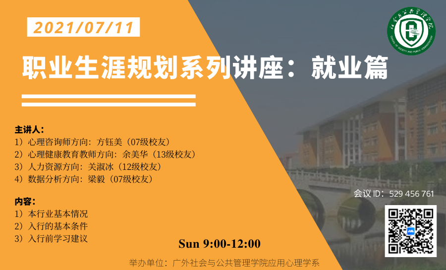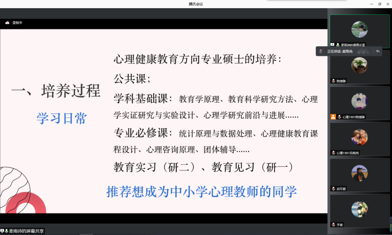 2021年7月11日上午9点,伟德国际victor1946应用心理学系师生通过腾讯会议召开了应用心理学系职业生涯规划系列讲座(三):就业篇。会议由学生代表应用心理学2018级戴琦昕主持。伟德国际victor1946张信勇副院长、应用心理学专业全体研究生和本科学生参加了此次讲座。
