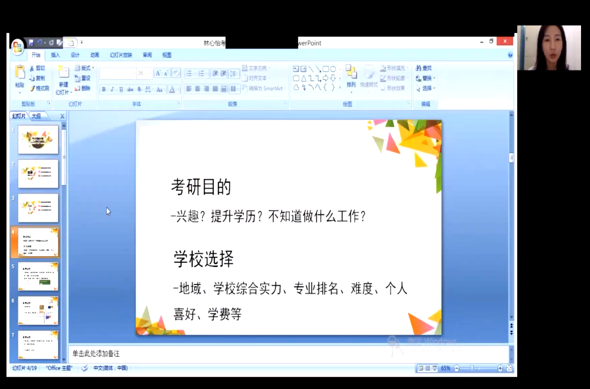随后,林心怡校友通过视频的方式分享了自己的考研经历并鼓励同学们要持有坚定的考研决心。她表示,选择院校时需要考虑自身兴趣、考研目的、学校综合实力等因素,并且提醒同学们要基于报考院校官网上提供的信息结合自己的实际情况制定相应的备考方案。除此之外,她还为同学们提供了自己考研时的学习方法,例如思维导图、学习网站等。紧接着,她解释了研究生初试和复试的过程与考察的内容,让同学们对研究生入学考试有一个详细的了解。此外,林心怡校友立足自身读研经历,分享了中山大学心理学专硕的培养过程和自己的读研日常生活。她表示,读研是一个痛并快乐着的过程,自己的逻辑思维能力随之也得到了提高。最后,她从实习经历、就业方向两方面分享了心理学专业的职业规划过程。