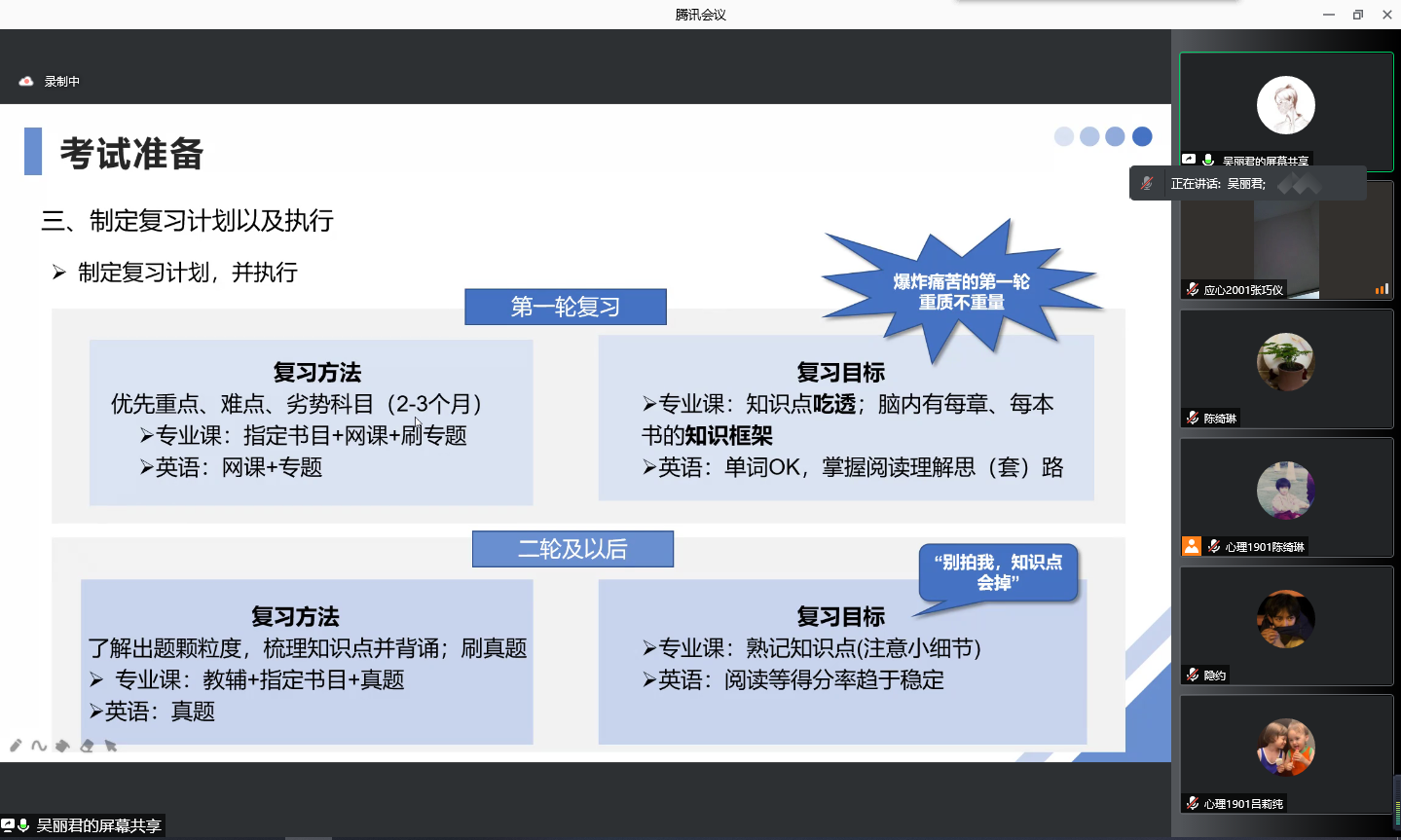 吴丽君校友从如何了解心理学硕士点院校和每所院校开设的心理学专业信息两方面向同学们分享如何进行学校的选择。此外,她还从自身经验出发,分享了她在备考过程中运用的学习资料、复习计划以及执行方法,在考试准备方面为同学们指明了方向。然后,她列举了在攻读研究生期间需要上的课程、公共活动以及科研项目,向同学们展现了研究生的培养过程。她从学术型硕士的角度出发,分享了科研方法和心得体会。最后,吴丽君学姐提到了自己在硕士毕业后是就业还是读博上的思考与考量,处于职业规划迷茫阶段的同学们深受启发。