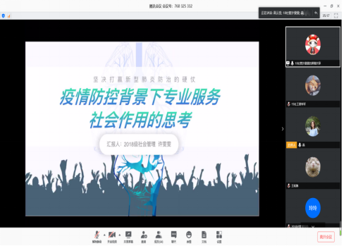 各班代表就本次德育论坛的主题,并结合志愿服务经历,为大家分享了其自身的思考。2018级社会管理专业许雯雯从社会组织的层面进行分享,就其多类主体的角度出发回答“如何依托社会治理做好疫情防控工作”的问题,认为各主体之间要做到协同联动,构建多元治理体系,才能更好地战胜疫情。2019级社会管理专业张涵结合疫情防控事迹和专业服务事例进行分享,提倡同学们要扎实好理论知识,通过实践来了解社会,从中获得学习经验,并鼓励大家“以梦为马、以汗为泉、不忘初心、不负韶华”。2019级社会工作专业朱慧伶分享自己参与翻译志愿服务的事迹,并从社会工作角度进行“疫情防控背景下的广东社会工作”的主题分享,希冀疫情能够带动社会工作发展,做到线上线下服务联动。2019级社会工作专业魏智豪讲述了自己在一线参加抗疫志愿服务的历程,并结合钟南山院士的事迹,鼓舞同学们要向钟院士学习,将扎实的知识和强健的体魄结合起来,更好地为社会做力贡献。2019级应用心理专业李勇智介绍了国内抗疫视频和国外校友事迹,也分享了应用心理专业同学参与到心理援助和心理康复等服务内容,最后他表示对未来的疫情防控有信心,期待早日回归校园。