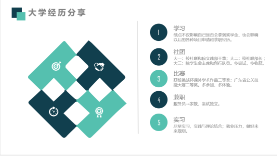 接下来是两位获得国家励志奖学金的同学进行了分享。17行管班的刘晓青同学为大家讲解了国家奖学金与国家励志奖学金的区别,并从五个方面为大家分享了自己的大学生活,她指出,成绩是非常重要的,同时在社团中也要尽力地投入,多参与比赛与兼职、实习等类似的实践能够很大的提升自己各方面的能力,要学会提前做好规划和尽早地为未来做好准备。