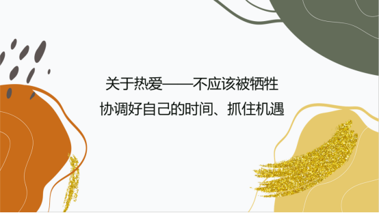 郭晓玲同学以自身的实践经历为大家分享了一系列的学习上、生活上的经验,点明了提前规划与努力调整自己的重要性,同时鼓励大家更多地参与比赛与实习,最后祝福了伟德国际victor1946与广外学子能够越来越好,热爱并且投入到每一件值得的事情上。
