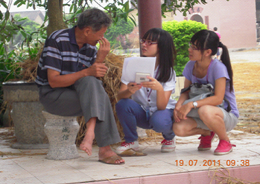 接着队员们就深入下乡,希望能够得到当地农村居民的第一资料。途经之处,风景迷人,葱葱的大榕树,袅袅的农家烟,一亩亩的良田,一车车的收获,组员们完全把自己融入到了世外桃源之中。走过了一条笔直的水泥路,调研小组来到了一棵大榕树下,一位和蔼可亲的老人家坐在凉亭里,机不可失,组员们就马上向前请老人家加入到我们的调研对象中来,由于组员的耐心与诚意,老人家很快就答应了大家的请求。