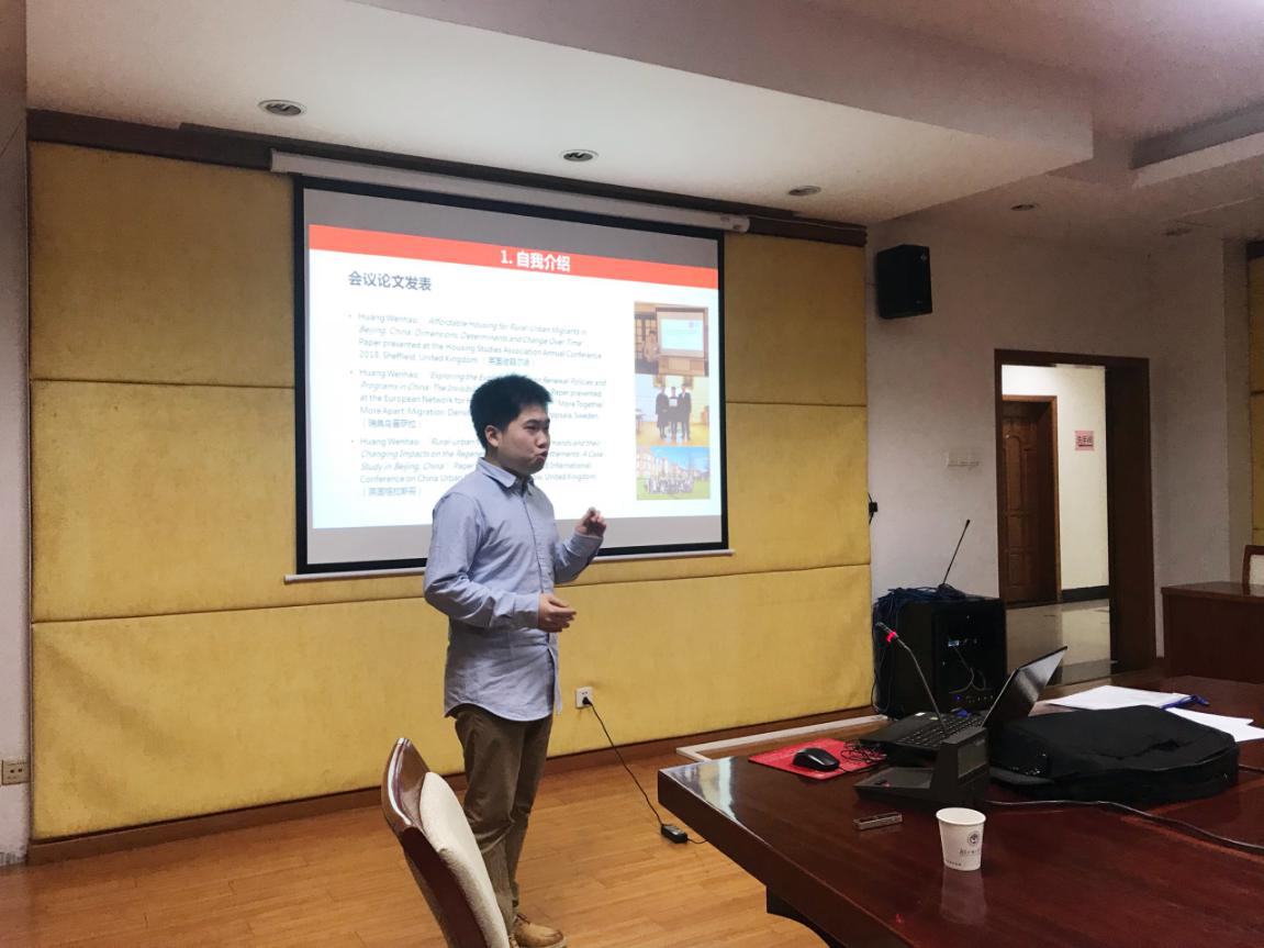 黄文浩以“非正规住房更新与农民工居住满意度变化:以北京市为例”为题展开讲座。他指出,已有研究发现城市中的农民工往往被视为“弱势群体”,他们的诉求很难得到城市政府的回应,尤其在住房问题上。以北京市为样本,他采用混合研究法(Mixed Methods),把一种定量分析方法和一种质性分析方法搭配使用,通过解释式设计来探究非正规住房更新是否导致农民工居住满意度的提高,同时还研究了导致农民工居住满意度的变化的影响因素。研究发现:第一、住房所附带的社区服务是影响我国大城市农民工居住满意度的重要因素,这一因素并未随着时间推移而改变,相反,因为一些成功改革经验的出现而不断加强,农民工越来越关注公共服务的获得,如深圳“水围柠盟人才公寓”项目;第二、非正规住房更新没有直接导致农民工居住满意度的提升,甚至部分地方的暴力拆迁行为反而引发了官民之间的矛盾,并且损害了农民工的住房利益;第三、城市政府的住房供给和住房更新政策会导致农民工居住满意度的变化,相关政策的制定和执行需要关注这一部分人的利益。城市政府应承担可负担住房的供给责任。由此,他提出了以下政策建议:1、加快总结和推广住房改革试点经验2、全面推进住房规划和管理的长效机制3、把非正规住房改造与保障性住房建设有机结合起来4、引导社会力量参与农民工住房供给。随后的互动环节中,涂斌教授就北京市“城八区”问卷的前后测问题与黄文浩展开讨论。陈胜副教授就混合研究法与研究内容的衔接问题与黄文浩交流意见。邵任薇教授则肯定了该研究的理论价值与实践意义并对其研究结论中提到的“住房所附带的社区服务是影响我国大城市农民工居住满意度的重要因素”给予了更多的研究展望。