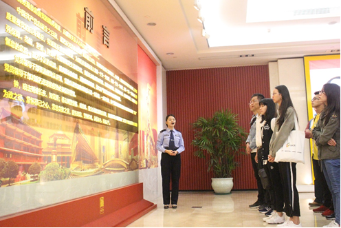 广东省反腐倡廉教育基地坐落于广州市番禺区番禺监狱旁,于2013年4月28日正式对外开放。基地以“反腐倡廉、警钟长鸣”为主题,一踏进大门口,映入眼帘的大厅正中央悬着一柄“利剑”模样的吊灯,以示“利剑高悬”,利剑下便是这庄严威武的八个字。在解说员的带领下,政管学院的师生们分别参观了“风正帆扬”、“从严治党”、“贪腐鉴录”、“拒腐防变”、“风清气正”五个展厅,各个展厅分别从历史和现实的角度剖析各大贪腐案例,又展示了广东省力行反腐倡廉的相关内容。