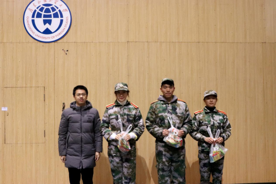 随后学院领导向全体参训教官、跟训朋辈导师、新生代表以及军训期间过生日的同学逐一发放慰问品,由于今年天气寒冷,学院还分别为每一位教官、朋辈导师、新生们准备了两份暖宝宝。同学们领取了慰问品后,纷纷表达了对学院领导老师们的感谢。学院的慰问温暖了同学们的心,给予了同学们刻苦训练的动力,让同学们感受到了学院对大家的重视与支持。