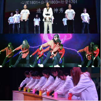 接着,“造化钟神秀”由来自心理1801的跆拳道劈板表演、公管1803班的“好汉歌”出神入化的舞蹈表演、17级行管班的小清新杯子舞联合演出。一环扣一环的演出,令观众不禁举起手机闪光灯随着旋律摇摆。