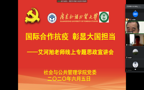 会议由学院院长、党委副书记彭未名主持。在介绍艾河旭老师简历时,他高度赞扬了艾老师不惧风险、迎难而上、勇于担当的精神,正是由于艾老师积极勇敢投入到伊拉克疫情防控工作,获得了各项成绩,如2020中国驻伊拉克大使馆“最美逆行者”荣誉称号、伊拉克卫生与环境部医学城抗疫荣誉证书、伊拉克——中国友好协会抗疫荣誉证书、中国红十字会总会抗疫荣誉证书、“广东省向上向善好青年”荣誉称号,并在我校“火线”加入中国共产党。希望全院师生以今天的线上思政专题讲座为契机,全面行动起来,发扬抗“疫”奉献的宝贵精神,时刻准备着响应国家、广东省的号召,将抗“疫”的精神融入到人才培养,精准高效推动特殊时期下的各项工作,实现疫情防控和学院教育事业发展的双胜利。