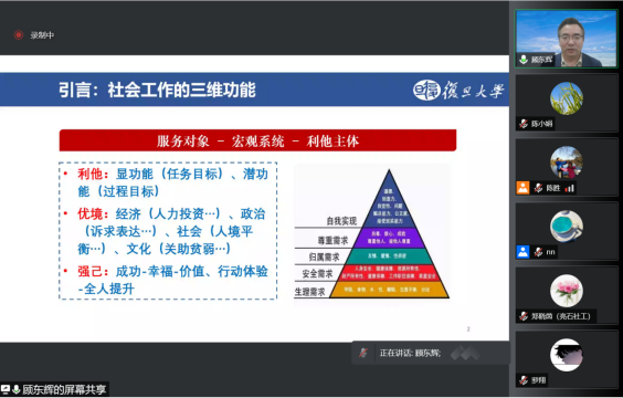 顾东辉教授认为社会工作具有服务对象、宏观系统、利他主体三个维度的功能,三维功能的实现取决于个人的综合素养以及专业认同。他强调,社会工作是一个与人打交道的专业,首先要对这个专业充分了解,具有足够的专业知识储备,才能更好的开展工作,并对社会工作的利他特色、应有之义、人境框架、一般过程、首要本领、多元交代、本土导向、行动研究等八个方面进行了详细讲解。