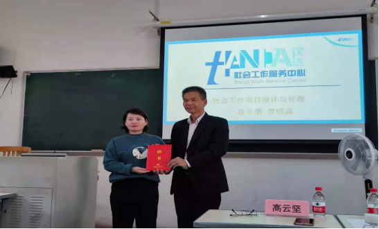 为了更好的落实社会工作专业“双导师”制工作,加强研究生实习实践的环节的推进与管理工作,我院在与广州市汉达社会工作服务中心共建实习实践基地的基础上,今天,在正式讲座之前,再聘请费明晶女士担任我院MSW的校外指导导师,高云坚书记为费明晶女士颁授了校外导师聘书。