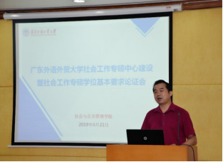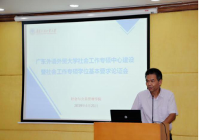 随后,全国MSW教指委委员蔡禾教授作为论证专家组组长主持了MSW学位基本要求和培养方案的论证环节。谢俊贵教授肯定了广外MSW教育中心的建设,特别是从专硕点初期就对标教指委要求和评估指标的做法是非常科学和严谨的,他建议专硕培养方向在硕士点建设初期不宜过多。李晓凤教授指出广外MSW要突出学校特色,在教指委要求的基础上有所突破。卓彩琴教授提出要重视专业实践实习,在课堂教学与实践教学中重点培养学生的实践能力,体现专业硕士的特点。贺立平教授建议MSW的专业方向结合广外的“外”和“贸”的特色和优势,可以多从中观层次来考虑方向的设置。黎玉婷会长指出,MSW专业课程设置应该多考虑行业需求和职业需求,要聘任具有丰富实践经验同时对理论有深度思考的行业专家作为校外导师。最后,蔡禾教授进行总结发言,他指出我校MSW学位点建设起步的阶段不要过多考虑规模,而是要认真按照教指委的规定,认真踏实地把学位点建设好,要夯实基础,注重体现广外特色,力争“小”而“美”。在总体上,蔡禾教授认为广外的培养方案论证得很充分,预祝广外MSW教育进展顺利。