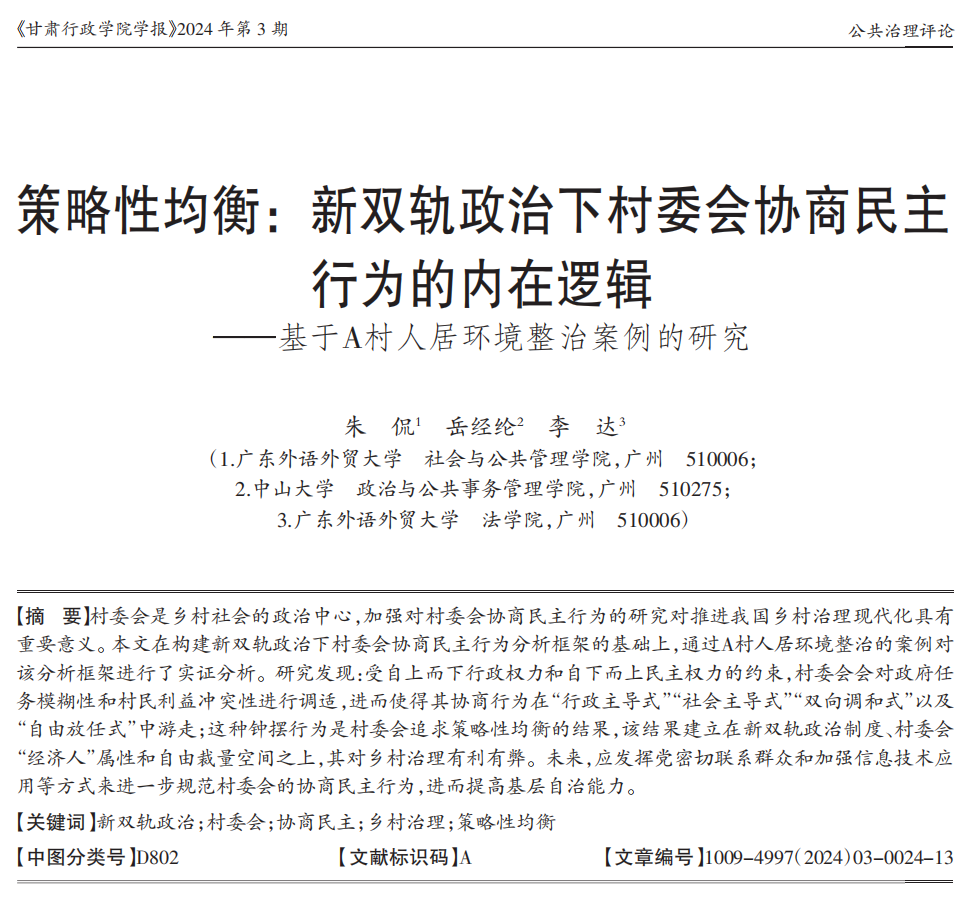 论文题目:策略性均衡:新双轨政治下村委会协商民主行为的内在逻辑——基于A村人居环境整治案例的研究