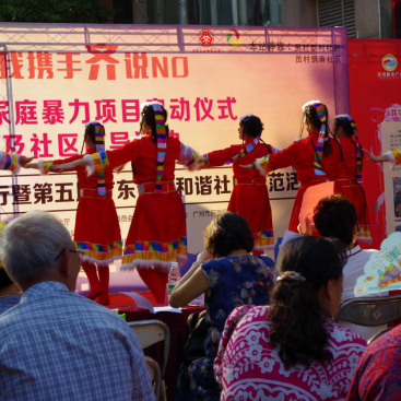 活动现场有以反对家庭暴力为主题的文艺表演,舞台下座无虚席,人山人海。安保组的同学们负责现场秩序的维护,机动组的同学们负责拍摄、准备应急工作,还与前来参与反对家庭暴力活动的社区居民进行了交流。一个个精彩的节目过后,反家暴活动接近尾声,领奖组的同学代表“超能社工”义工队,上台领取“广州市天河区反对家庭暴力志愿宣传队”荣誉证书。