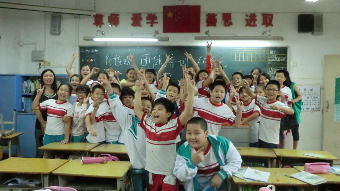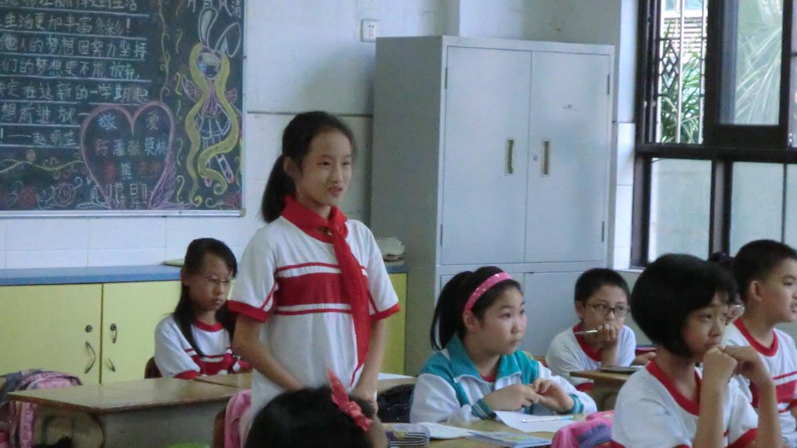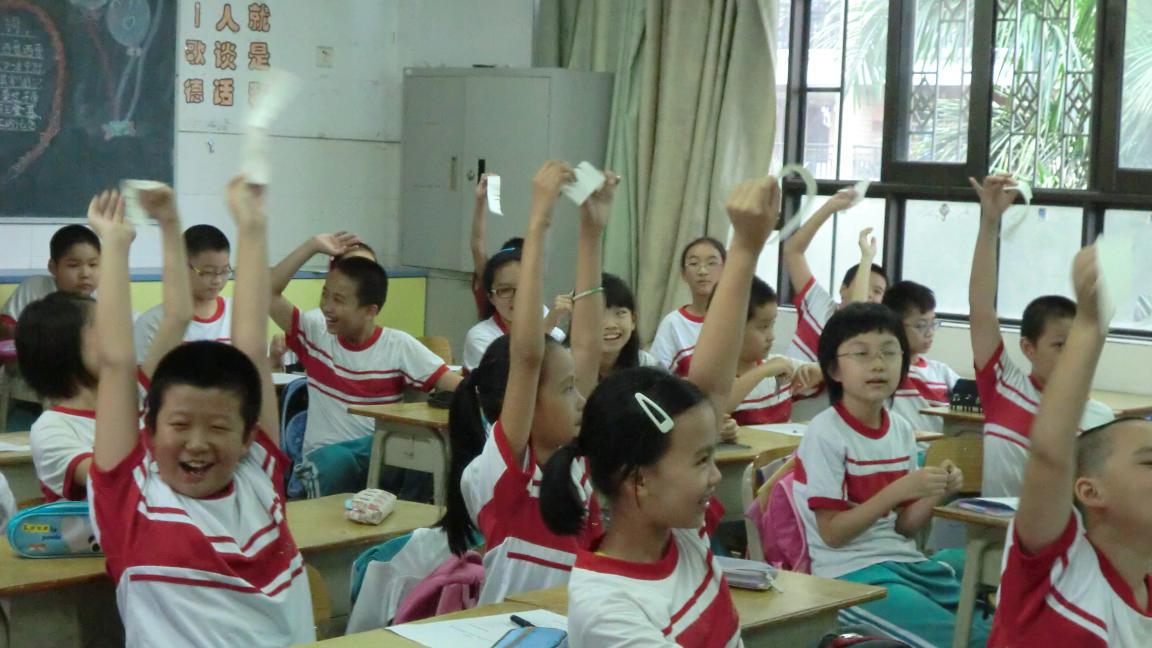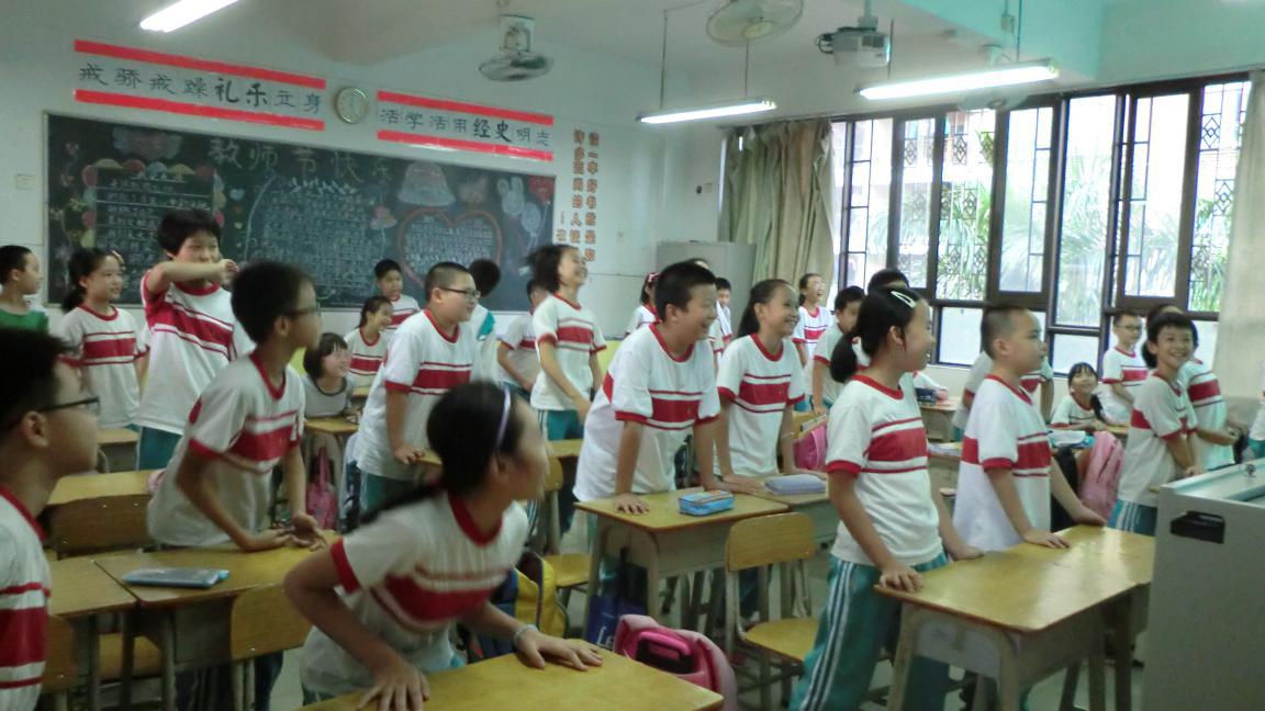 随着员村小学第三节课上课钟声的响起,两届心理班的培训师们踏入教室,开始今天的培训。简单的开场介绍后,开始了热身游戏“看谁反应快”。培训师朗读一段关于文明乘车的小短文,让学生在听到“站”的时候坐下,听到“坐”的时候站起来。学生们立刻进入了状态,认真地听培训师的朗读以便可以快速做出反应。学生们略带紧张的表情、偶尔的出错和欢乐的笑声使现场马上热闹起来。