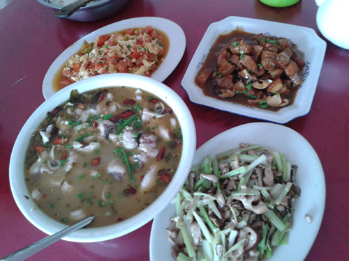 在做完正事之后,两个队长回到福田镇中心的一间小餐馆里,准备好好地干一顿,队长们点了两个肉和两个菜,可能是因为农村与城市的物价水平不一样,在这边吃的东西好吃多了,而且肉也明显多了,这一顿,两个队长都吃得好抱,他们决定,等三下乡结束后,带同学们来这里大吃一顿。