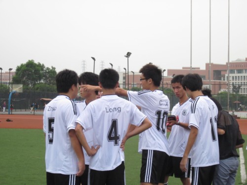 离比赛开场前的40分钟,10行一的男同胞们早早地来到足球场上进行训练。他们整齐划一的足球装备,突显了他们的专业化,较上一场对阵10行二时的“万国牌”服装,给人一种眼前一亮的感觉。赛前,队长陈龙淳和主将陈熙给大家讲述了比赛的战术和人员配备,做好了充足的准备。