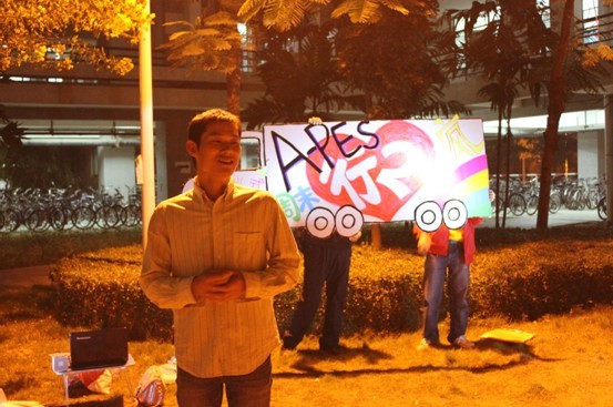 2011年11月25日星期五晚上10点05分,行二A-pes周末疯在二饭门前大草坪举行开疯仪式。出席本次活动的嘉宾是辅导员陈三峰老师。参加本次活动的有10行二以及11行二的同学们。