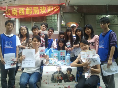 抵达目的地江南西邮局,并与其工作人员进行沟通后,全体队员便开始了今天工作的第一步——摆摊。