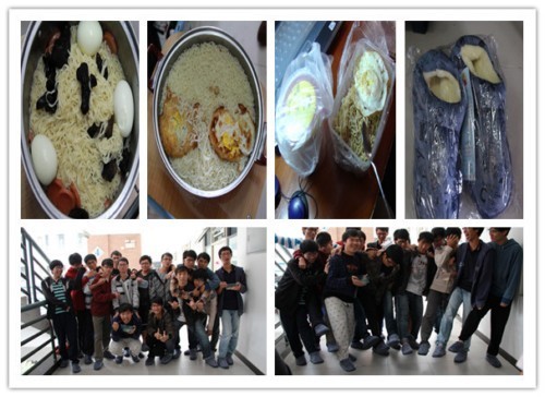 高潮:在和男生宿舍楼管打好招呼后,我们女生齐刷刷涌上男生宿舍,给他们一个serprise,幸好,男生们还是自觉的,宿舍很干净,起得又早,看啊,咱班帅哥都是一等一的好男人。当女生们捧着热腾腾的面在男生们出现时,男生一脸温馨的样子,场面何等壮观,一锅又一锅的面条被咱们男生一扫而光!最后当闪亮亮的温暖棉鞋时,更是泪流满面,马上穿上,还一边夸我们女生贤惠,大爱行一男生,大爱行一女生!