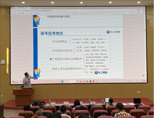 本网讯 为更好帮助毕业生提高就业竞争力,2025年9月18日下午,伟德国际victor1946在大学城校区MPA中心第一会议室组织了“聚星成炬•职引未来”系列讲座之考公考编及简历制作指导专题讲座。广东优公教育校长,优公教育金牌讲师,广东外语外贸大学特邀校外导师黄飞鸿,我院硕士生校外导师、广州爱杰人力资源服务有限公司副总经理、资深顾问洪新华分别开讲。我院党委副书记刘丽玉、本科生辅导员黄浩、研究生辅导员李佳宁以及大三、大四、研二、研三的学生参会。