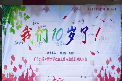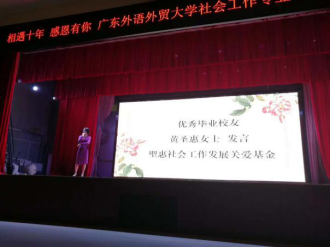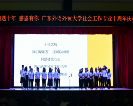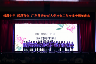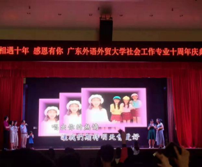 10月13日,广东外语外贸大学社会工作专业十周年庆典在南校区学生活动中心隆重举办。广东外语外贸大学社会工作专业从2008年开始招生,至今已招生10届共406名学生,已经毕业281人。时光荏苒,岁月峥嵘。毕业生们或投身社会服务事业,或继续求学深造,或活跃在社会组织、政府部门、企事业单位和各领域。此次主题为“相遇十年,感恩有你”的庆典,各级领导、各界来宾、各地校友欢聚一堂,共同庆祝社会工作专业十年发展历程。庆典开场播放了社会工作十年发展历程视频,一张张熟悉的面孔,一次次新的突破,带我们回顾了十年一步步走来的道路,让人心潮澎湃。