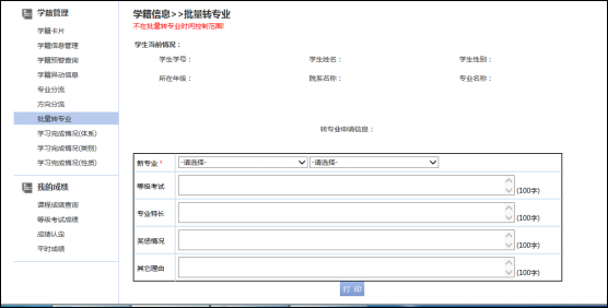 完成提交,点击打印。(打印的申请表请务必签名确认,最好一式两份,以便转出、转入学院都可以使用。)