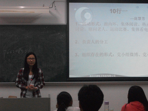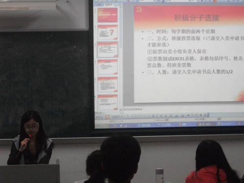 培训第二项是由陈敏同志作主讲的。她为各位负责人先后讲解了入党积极分子选拔的相关事项,包括选拔的时间、方式以及人数;叙述了党校培训班的有关事务,包括对选择参加培训的人的选拨方式、参加培训的报名表以及培训班中的小组长的作用;随后更着重提出了党小组活动的注意事项:活动的次数为每学期3次(大三的小组为2次),活动的基本信息表以及活动记录表的填写,活动的记录视频的要求。另外,她还说到,党小组负责人是需要接受考核的。该考核是通过党小组成员的信息更新状况、积极分子的选拔情况以及党小组活动的展开对负责人进行评价,若不合格的情况达到三次或三次以上,则该负责人会受到相应的惩罚。相信此制度能有效地提高党小组负责人的对党小组活动开展的积极性,同时让党小组成员更好地发展,让党小组更优秀。
