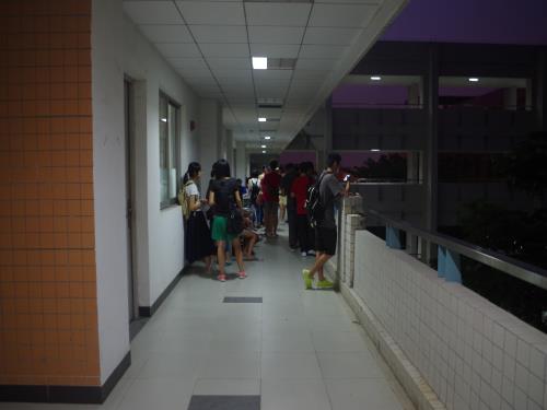 临近七点,新生们陆续到来,他们左顾右盼寻找自己的心仪部门。然后按照顺序地签到,领到自己的号码后就在面试室外等候。他们或静坐,或者低头默念。看来对这次的面试很重视呢。