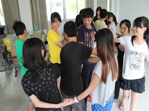 接着就是欢乐的游戏时间了。一个看似简单的解锁游戏却隐藏着大智慧,只有团结一致,集思广益才能从那一个个交叉的双手中还原到原本的大圆圈。经过各方的努力,我们小组在最短的时间内完成解锁任务。很喜欢这个游戏,在这里,每个人的每一步都很重要,一着不慎,满盘皆输。就像一个团队一样,每个人都是发挥着作用的,如何能够充分发挥这个团体的作用则是我们应该思考的问题。而这个游戏也更加让我们懂得了团结的重要。