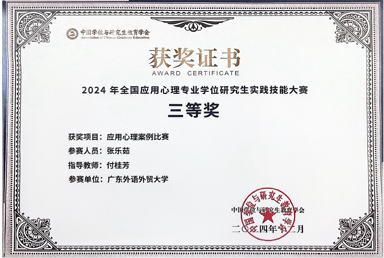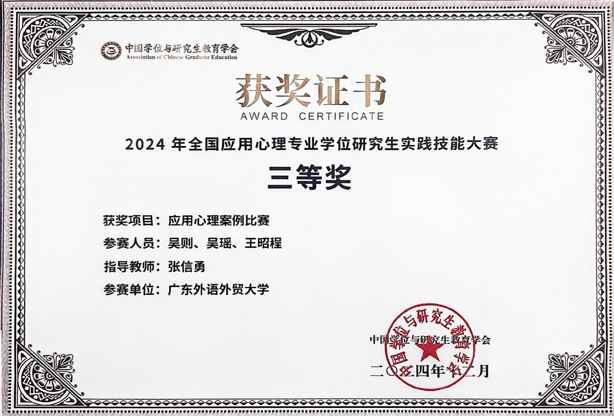 2024级应用心理硕士研究生吴则、吴瑶、王昭程、张乐茹获2024年全国应用心理专业学位研究生实践技能大赛三等奖