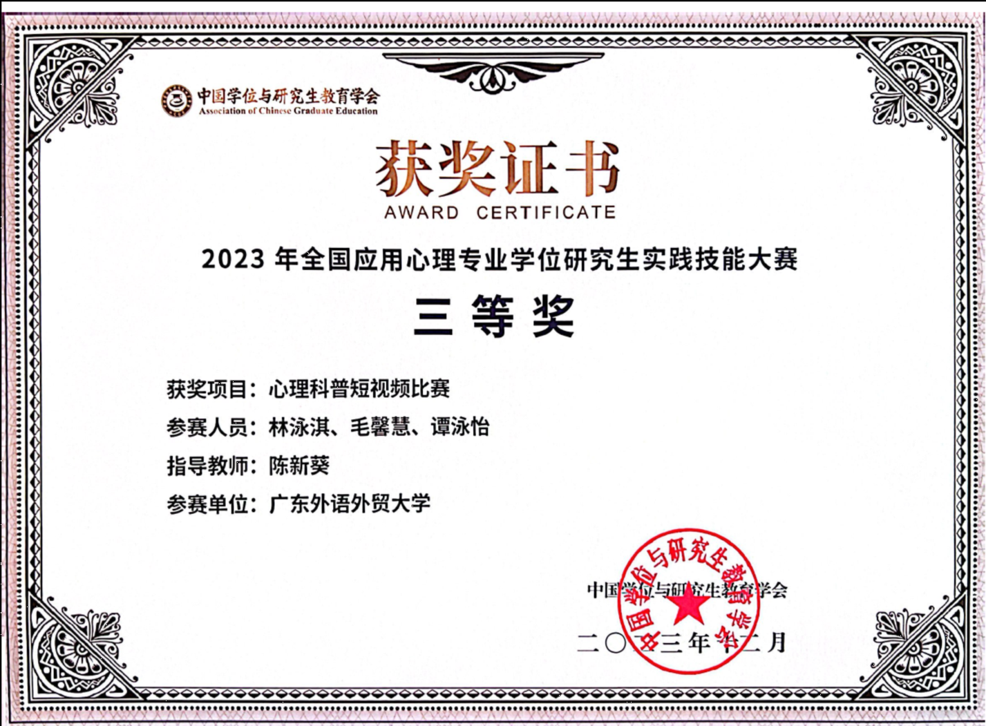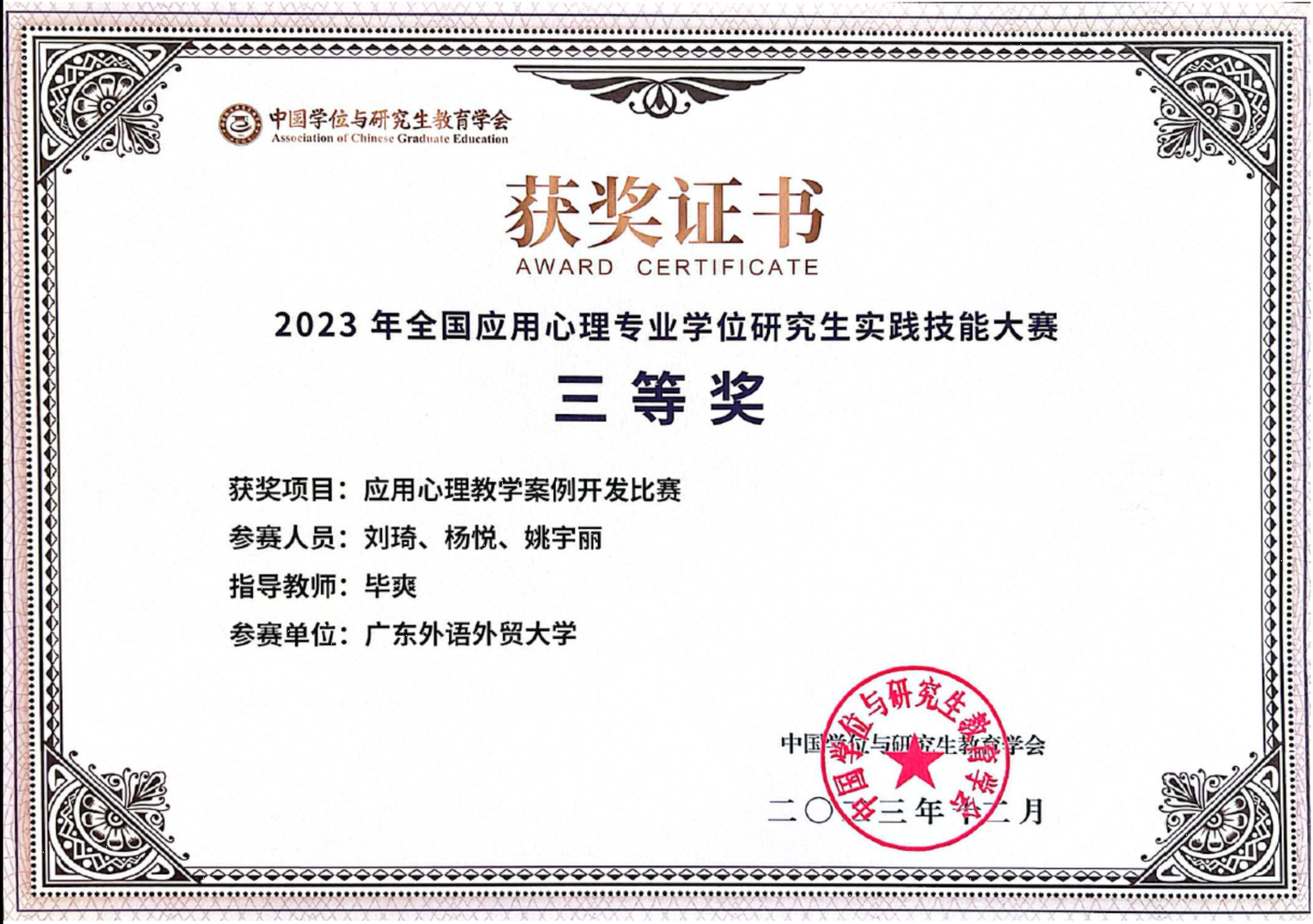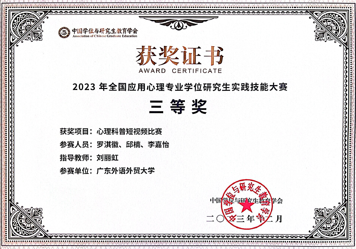 2023级应用心理硕士研究生林泳淇、毛馨慧、谭泳怡、刘琦、杨悦、姚宇丽、罗淇徽、邱楠、李嘉怡获2023年全国应用心理专业学位研究生实践技能大赛三等奖